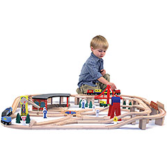 This is such a great set ... We gave it to our train-loving three year old, but all of the older members of the family have had a great time with it too. It has lots of very interesting pieces that make for lots of fun building tracks and playing with them afterwards. The cranes, bridges and train shed are all great favorites and they are well made so I expect they will last for a long time. This was completely compatible with our other wooden tracks and all of the various trains meant to go wit